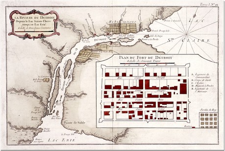 Řeka vytékající z jezera St. Claire do jezera Erie se nazývá Detroit, což ve francouzštině znamená „úžina.“ Teče na jih, má mírný proud a hloubku dostatečnou pro lodě s velkou nosností. Město Detroit leží na západním břehu řeky asi patnáct kilometrů pod St. Claire. Téměř naproti leží na východním břehu starodávná vesnice Wyandotů (Huronů). Je to kmen, o kterém psalo již mnoho autorů, proto vynechám jejich popis. Žije mezi nimi misionář s povolením kanadského biskupa. Břehy řeky Detroit jsou posety osadami rozprostírajícími se třicet kilometrů do šíře. Krajina je mimořádně úrodná a vhodná pro pěstování pšenice, kukuřice, ovsa a hrachu. Najdeme zde mnoho kvalitních pastvin. Francouzi se po dobytí těchto oblastí generálem Amherstem podřídili anglické vládě a více se věnují obchodu s indiány než zemědělství.